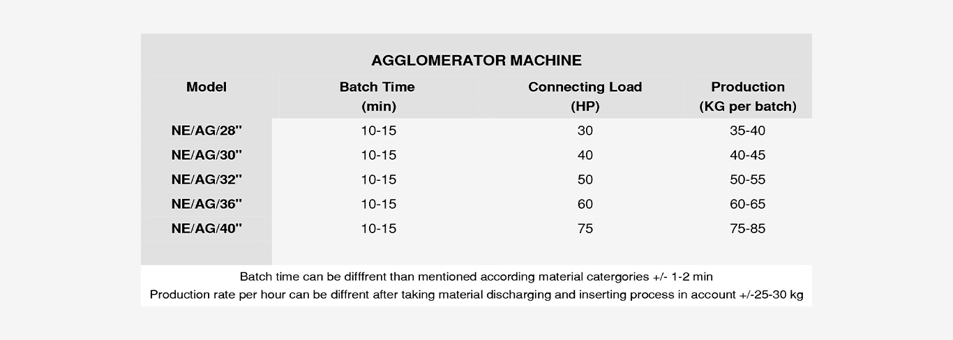 In the entire process, A plastic material, normally in wastage form (film waste) is dropped into agglomerator feeding spot , reach the rotor whilst rotor is in rotating condition. Blades cut the film plastic constantly which creates friction and heat until it reaches the desired size. This process causes material to reach to the softening point. In this stage, operator add some water to create a kind of shock. After water evaporates, material comes out from discharge spot as chips.