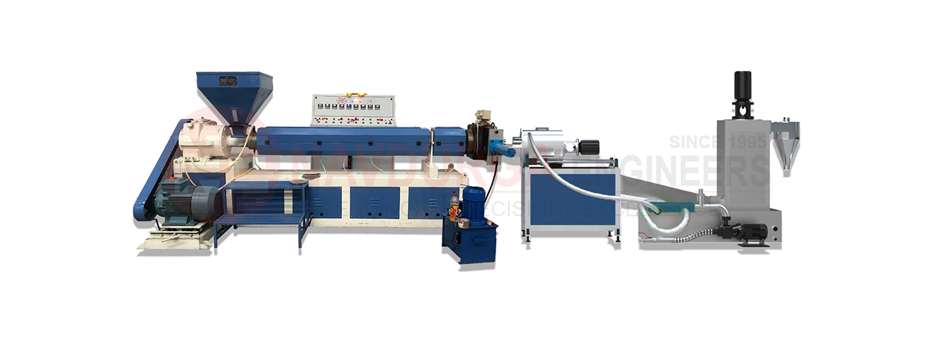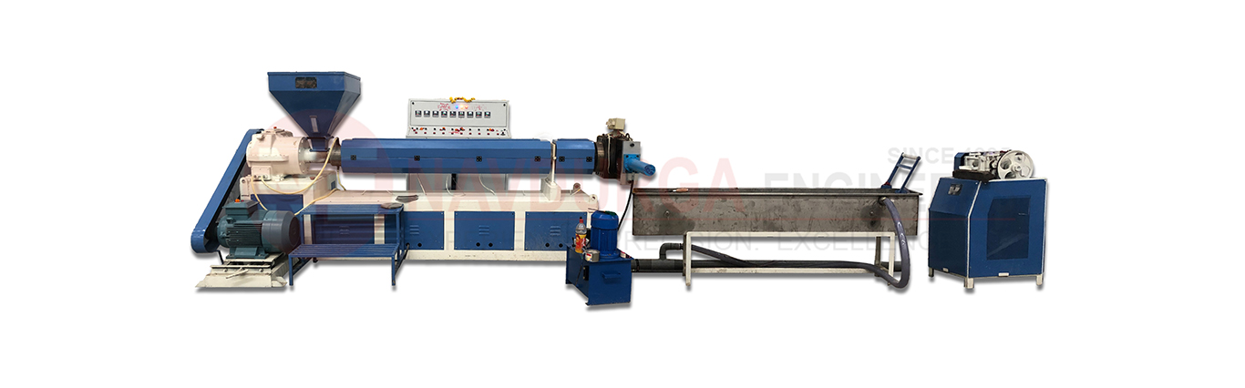 In the entire process, A plastic material, normally in flakes form is placed into hopper of extruder, usually made from fabricated from mild steel or fabricated from stainless steel as per material requirement. There is a hopper magnet fitted inside the hopper to stop metallic particles from entering inside the barrel. The raw material in the form of flakes, is gravity fed into the hopper and through the feed throat, drop on the rotating screw. Barrel has a air vent for degassing the material and machine contains the AC frequency drives to adjust the motor rpm. Barrel has several amount of heaters fitted on the outer diameter. Which heats up the barrel to get extrusion process job done. Screw is connected with helical gearbox and AC motor which helps to rotate the screw. Raw material in flakes form starts to move forward along the rotating screw and enters the heating spot of barrel. Where it starts to melt. Molten plastic reaches the end of the barrel where hydraulic screen changer is fitted which filters the molten plastic and leads it to the die face cutting unit where sharp blade is rotating on high rpm on face of outer side backer plate of the screen changer. This blades cuts the molten plastic into round shaped pellets. Entire cutting process occurs In presence of constant water circulation. Finished pellets travels to the de watering unit along water flow. In de watering unit, pellets get completely dry and travels to the storage silo with the help of hot air blower.