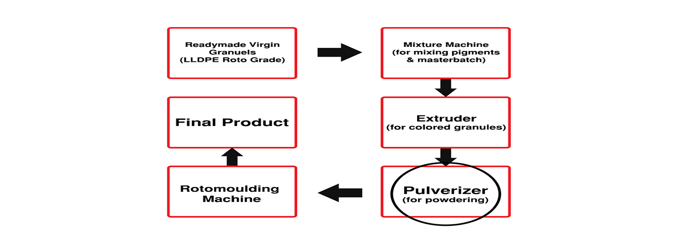 In the entire process, A plastic material can be in granules form (for lldpe) or in flakes form (for pvc) is placed inside the hopper of pulverizer machine, the raw material starts to feed inside the housing of the pulverizer machine. The housing contains one set of blade, which blade is made of special material which gets the job done. Plastic granules enter in the housing and collected in the center of the grinding disc. It is then pushed outwards by the centrifugal force between stator and rotary disc. Powder form of the material comes out of the housing with the help of blower which cools powder intensively and enters in the vibro shifter. Vibro shifter differentiate the powder uniformly and separate the unsuccessful grinded particles into different container which can be used for regrinding.