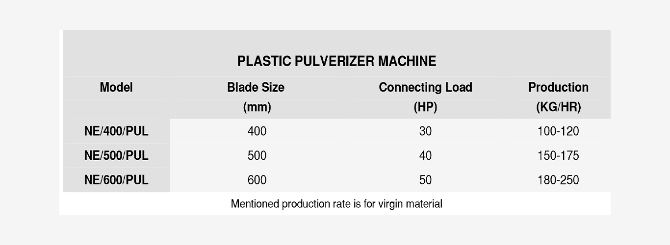 Complete design with flexibility & perform fine pulverizing of wide range of plastics material like LLDPE, LDPE and PVC other heat sensitive material.