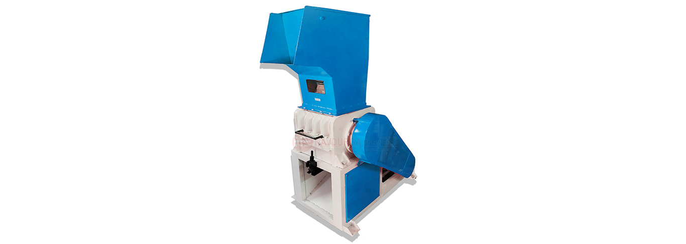 In the entire process, A plastic material, normally in wastage form (article plastics) is dropped into scrap grinder mouth, usually fabricated from mild steel. There is heavy duty dynamically balanced mild steel rotor fitted on the housing of the grinder to ensure faster grinding and defined output. Where’s heavy duty bearing housing provided for the rotor of scrap grinder machine. The blades are made from special alloy steel with hardening process. 9 rotating blades mounted on rotor and 4 or 6 fixed blades mounted on housing body of grinder machine. There is a pulley fitted on one side of rotor and balanced wheel mounted on other side of rotor. Flake size limiter mesh to be provided right below rotor to maintain output flakes size.